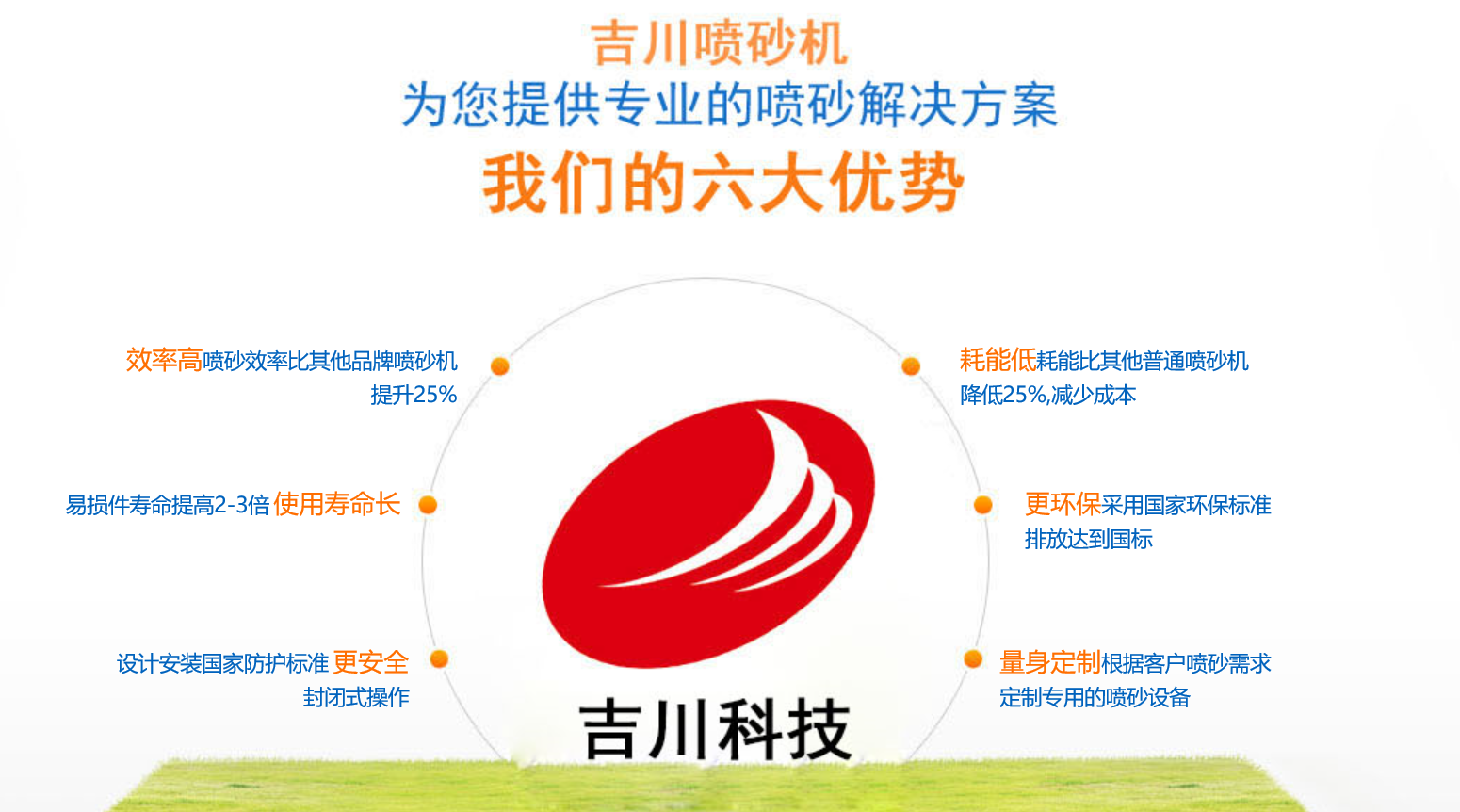 企业核心产品——“吉川牌”喷砂机系列、喷丸机系列、喷砂房系列、抛丸机系列;工业通风除尘设备系列等三大类。核心产品的规格型号,满足了不同档次客户的各种需要,尤其是具有特色的——自己研发设计、生产、制造、安装、调试的喷砂房,出口到澳洲 Panda 公司,造就了非凡的口碑;