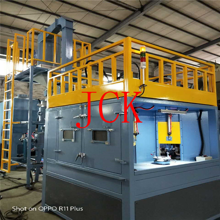工作方式:人工将工件装夹在小转盘治具上,由大转盘转动带动小转盘移动至喷砂加工位点,转盘被止动装置止动而停止转动,工件由小转盘带动旋转,喷枪分两组上下往复摆动对工件的表面进行喷砂加工,保证了工件喷砂均匀。加工完毕,止动气缸回缩,大转盘转动,工件由取放区拿出,同时下一加工程序循环而至,以形成连续工作状态。本机配置的抽风系统,可实现砂料与粉尘的有效分离,保证产品加工的高质高效,同时降低砂料的消耗;除尘箱能有效地清理室体散步的粉尘,防止外泄,使操作者能有一个良好的工作环境。