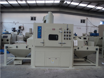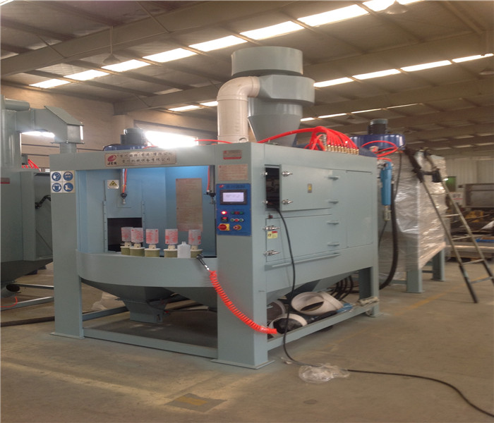 转盘式自动喷砂机又叫转台式自动喷砂机、间隙式自动喷砂机、连续式自动喷砂机。他也是一款高产能、高效率的自动喷砂机。喷砂大转盘上上配置8个小转盘,又分为4个区域,喷砂装卸区、喷砂待加工区、喷砂加工区、吹净室。需要喷砂机的产品人工放在喷砂装卸区。大转盘会自动旋转,整个旋转在360°人工只需要站在同一位置将产品装、卸即可。用户也可根据自己的一些产量要求配置流水作业,但是配置装、卸区一般需要机械手,成本较高。