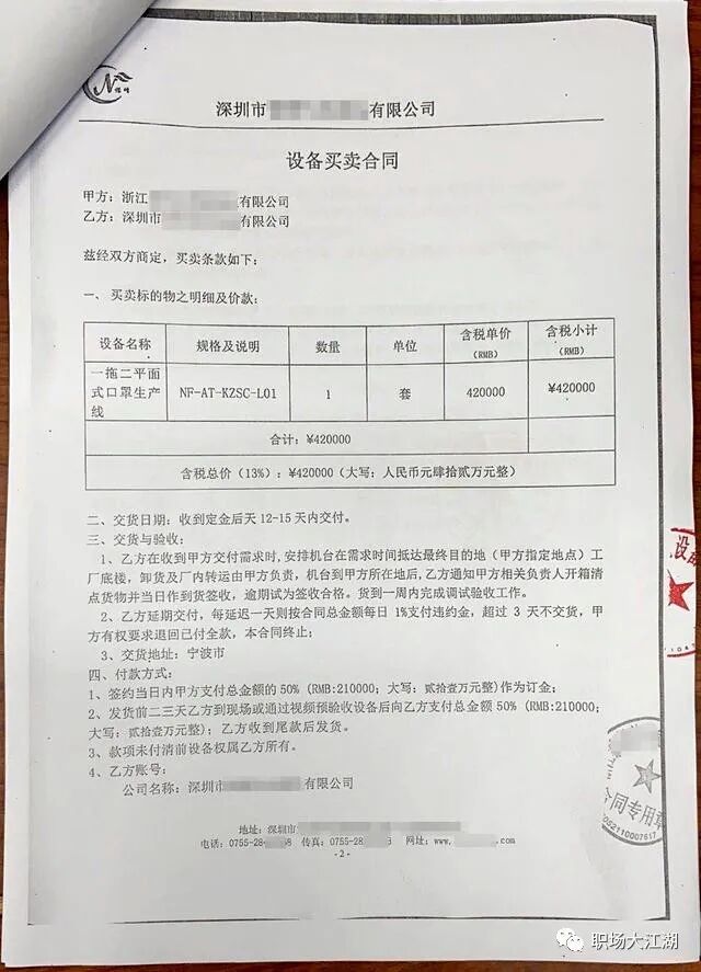 销售对我说,现在下单,50万元一台,15天后交货。看了一圈,没有比这家更靠谱的了,工厂也有1000多人,是个大厂,而且的确也做出了样机。于是,我就和他们签订了合同,买了2台,转账付完款后,就回到泉州了。
