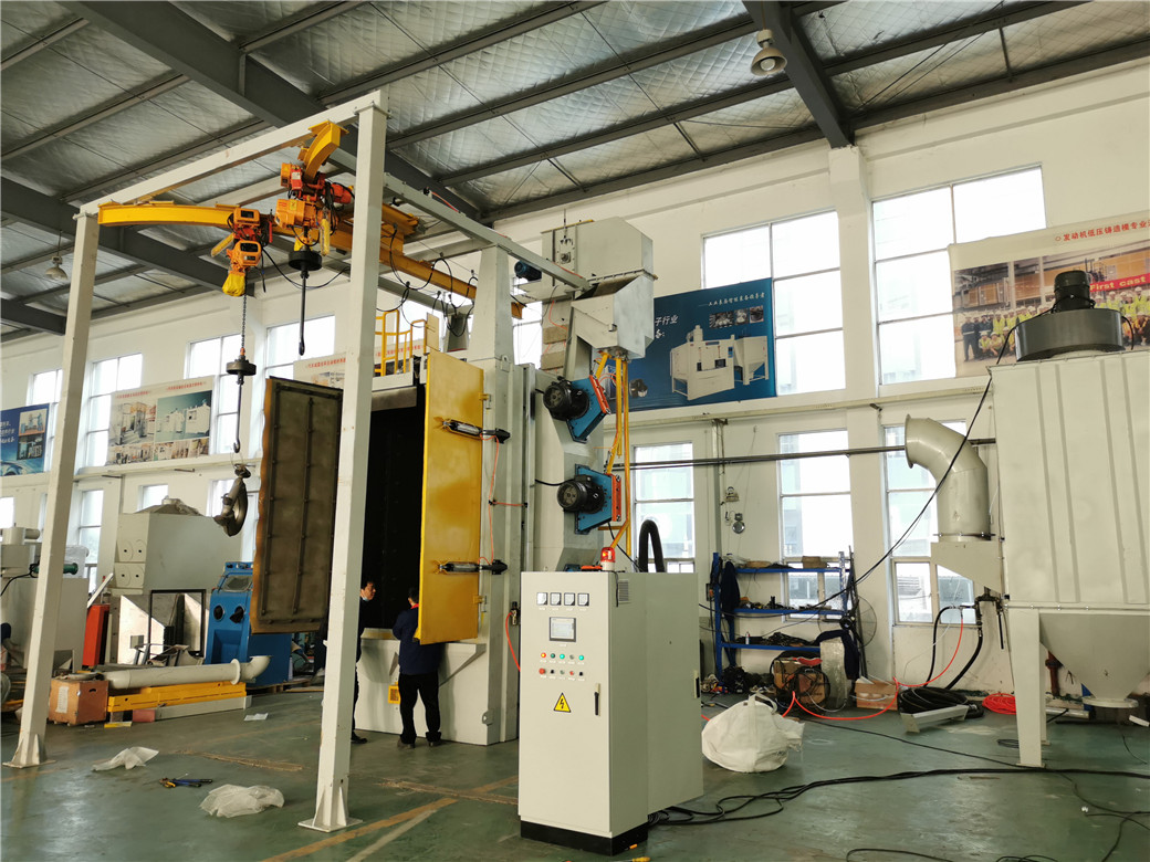 1、本机采用双吊钩吊挂形式,一外一内。在清理室内吊钩吊挂工件接受抛丸清理时,外部吊钩可人工卸下清理好的工件并挂上待清理的工件,当清理室内工件被清理完毕后,清理室内吊钩沿轨道走到一边,而外部已装好工件的吊钩便沿轨道进入清理室,这样便优化了时间,如此循环,大大提高了生产效率。本机结构紧凑,清理质量好,工作安全可靠,运转平稳。