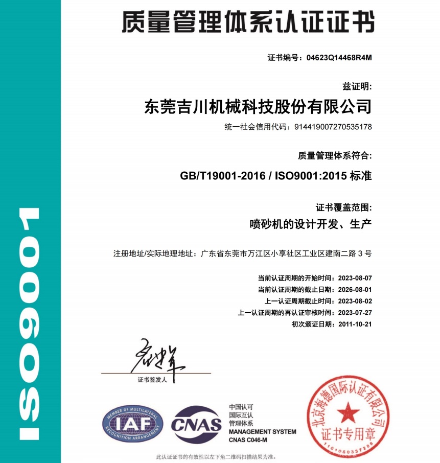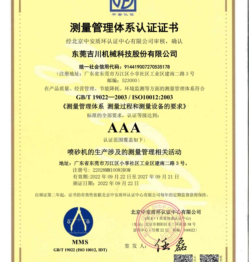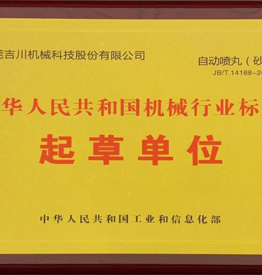 青岛喷砂机新闻:中国喷砂机制造国家标准参与者吉川喷砂机公司荣誉资质展示