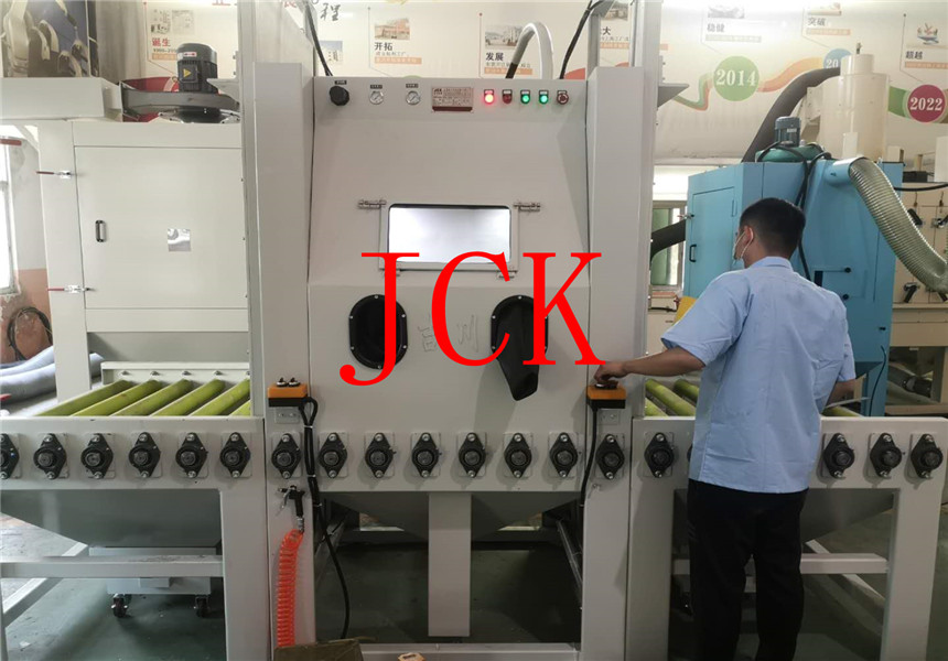 本机是根据贵公司的产品工件尺寸和处理要求而专门设计的(非标准型)输送式喷砂机,采用滚轴输送工件,通过机舱内调节挡板调控不同类型工件喷砂。