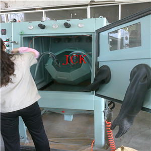 粉末冶金产品去毛刺喷砂机 产 品 说 明 JCK-1010D正面滚筒式喷砂机 特点: 1.设计新颖、美观大方、结构科学、操作方便; 2.一机多功能,既可以自动喷砂,也可以手动喷砂 3.本机标准配置两支高效喷枪,具备定时自动喷砂,点动定位等功能; 4.滚筒外径、喷枪数量可根据用户要求设计制作; 5.正面滚筒,取放工件、方便自如; 适应范围: 适用小工件的小批量生产喷砂,如:电木制品、螺丝、塑胶制品、纽扣、拉链、亚克力等。 参数: 工作舱内尺寸 1000*1000*800(mm) 机器照明灯 220V 13W 节能灯 电源 380V 50Hz 分离器电源 220V 50Hz 1100W 分离器分量 8.5m3(kg/cm2)2.0m3/min 除尘方式 袋式除尘箱,利用气动自动/震动清灰 机器净重 380kg 滚筒载重 15kg(最佳喷砂工作量5-10kg)