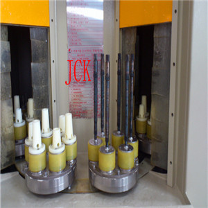 本设备是根据我公司针对转向器类产品和处理要求而专门设计的全自动转盘式水喷砂机,完全适合贵公司所提供的产品要求。根据贵公司对产品质量及喷砂效率的要求,本机共设置8个工件装夹位。大转盘每转动2个工位一停,喷砂舱内共布置8支普压高速喷砂枪,在喷砂区共设置2个工位做为喷砂加工位,即有2个工件在进行喷砂加工,布置8支喷砂枪对工件需喷砂部位喷砂加工。喷枪可根据加工需要,随意调整其喷射角度,并配有喷枪组前后距离调节机构,采用PLC程序化控制,配触摸屏操控面板,自动化程度非常高。